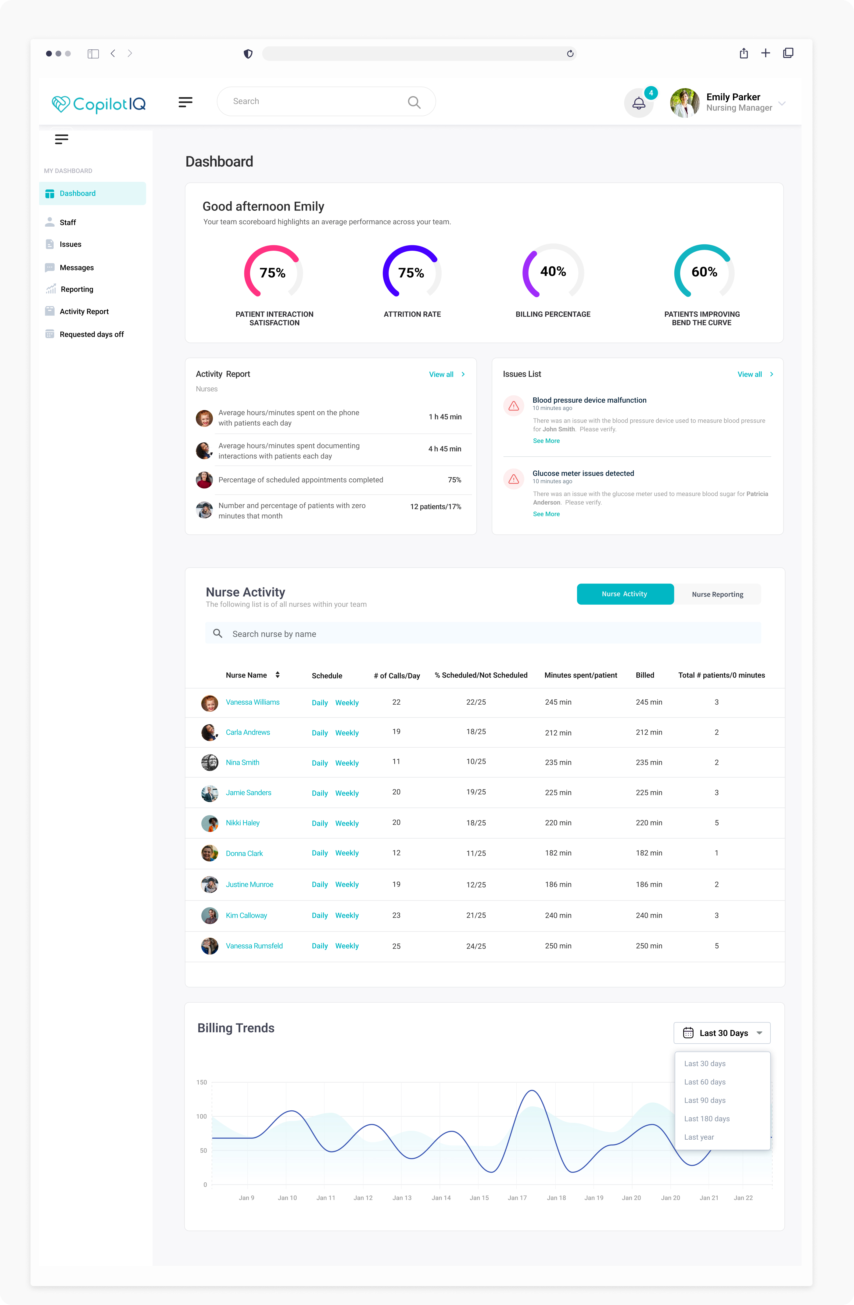 The Nursing manager through a dffferent user type login, will be able to track the performance of each individual nurse and also of the entire nursing team. This gives the nursing manager a global view of the daily operations and nurse to patient interactions.