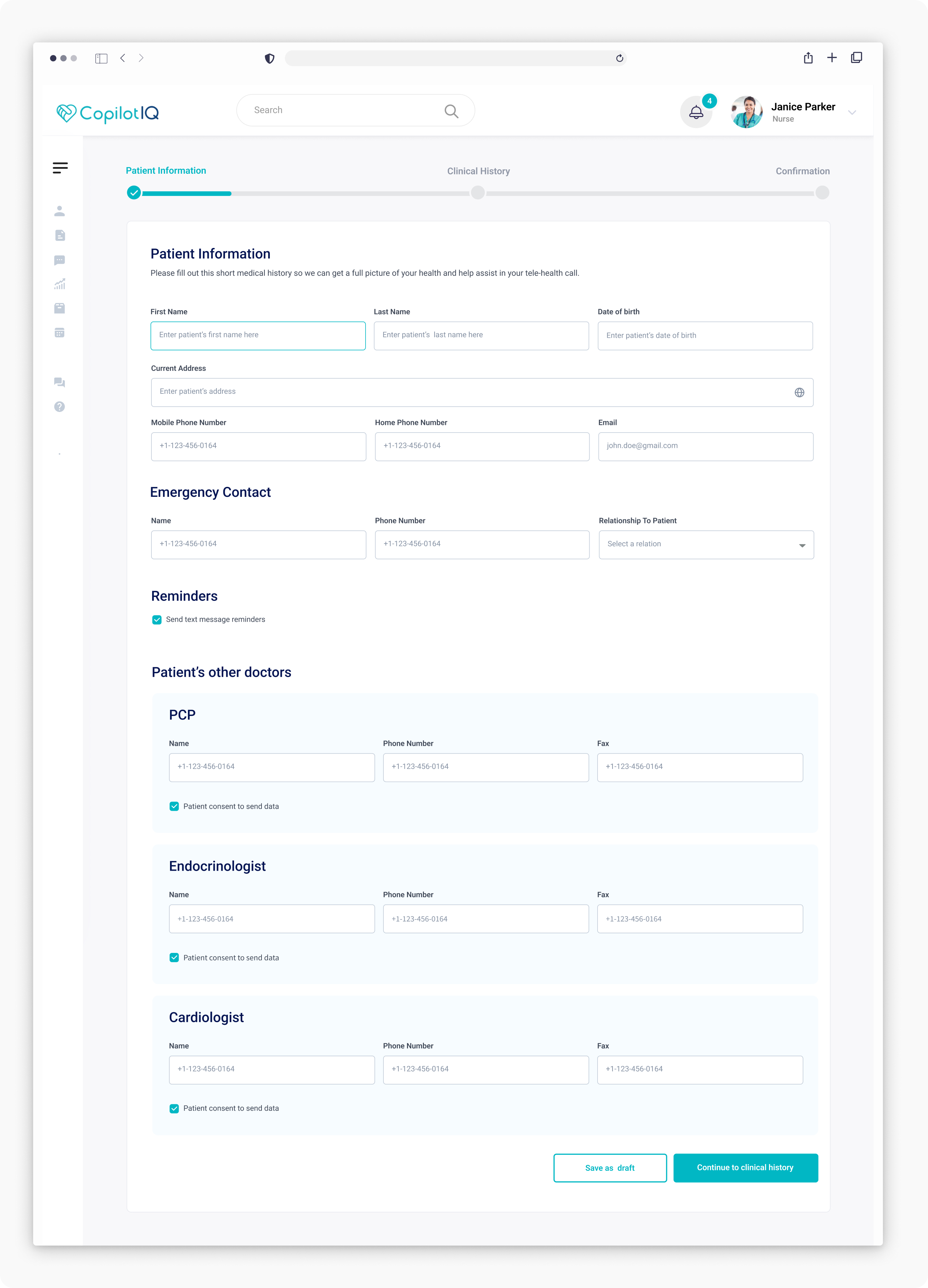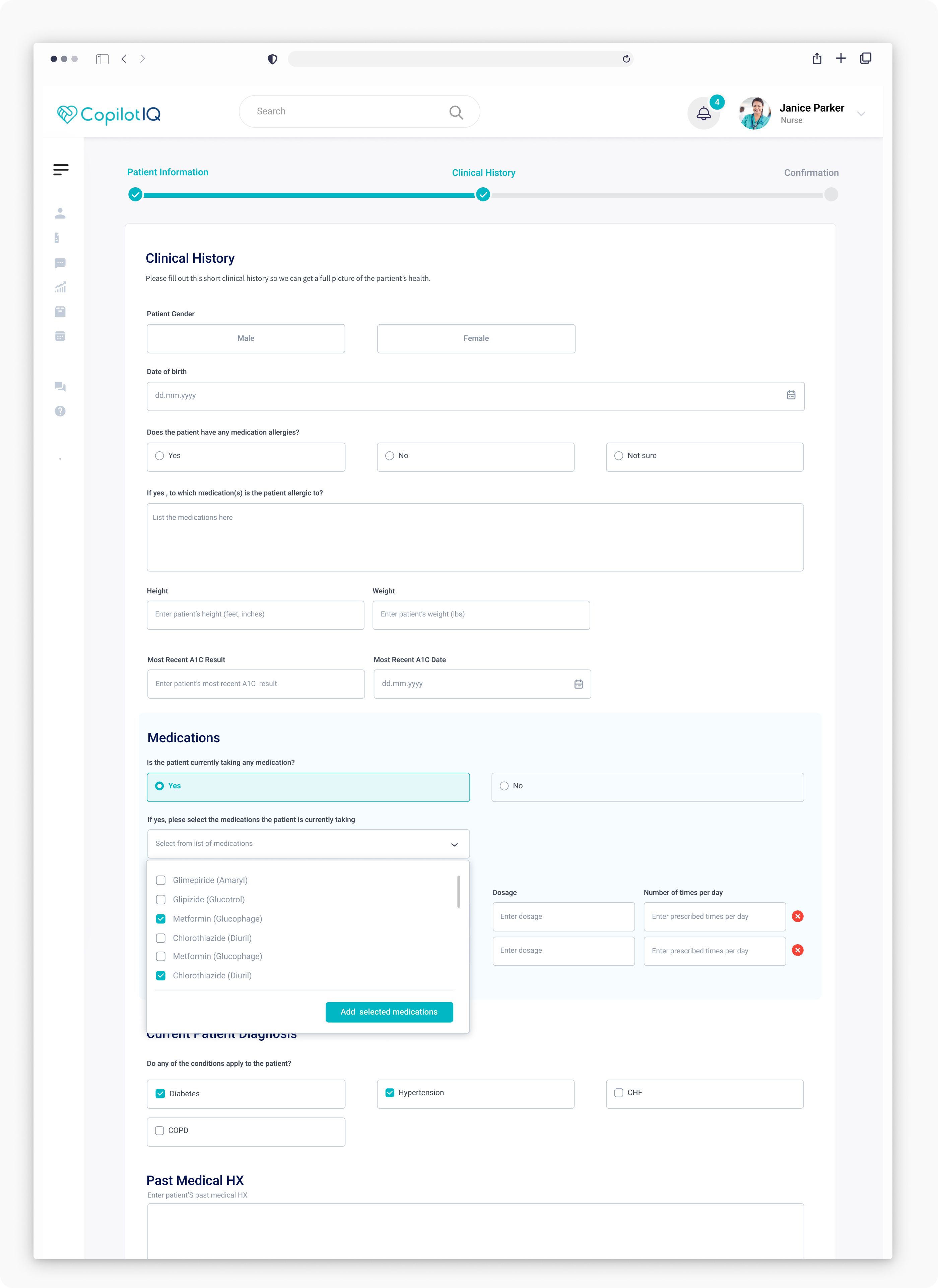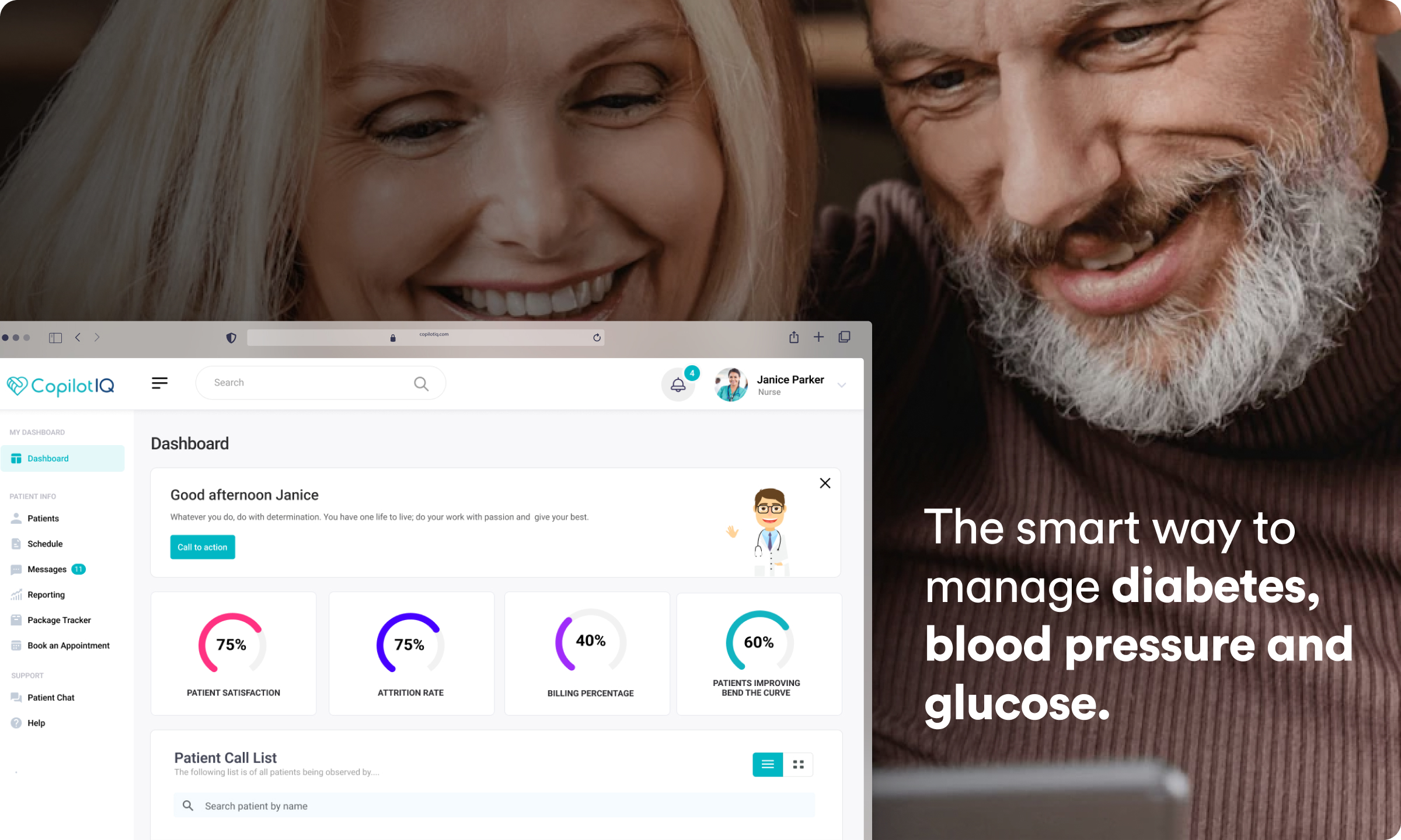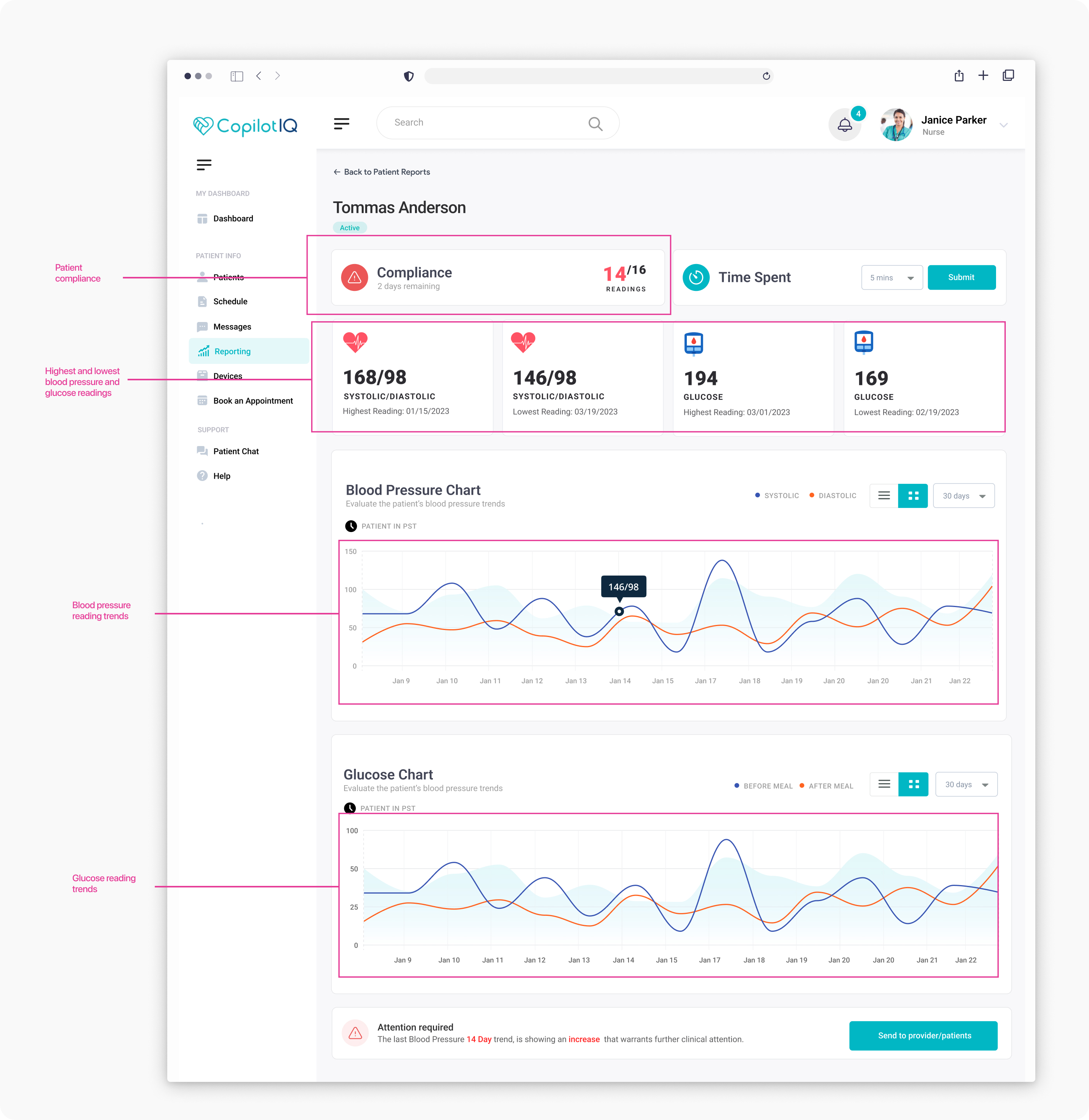 To extend the value of CopilotIQ's platform beyond basic monitoring, we created a comprehensive chronic care platform that integrates connected devices, predictive artificial intelligence, and continuous monitoring to deliver world-class care. The platform modernization introduced automated data collection from connected blood pressure and glucose monitors, enabling readings to be sent directly to the medical team for charting and analysis.