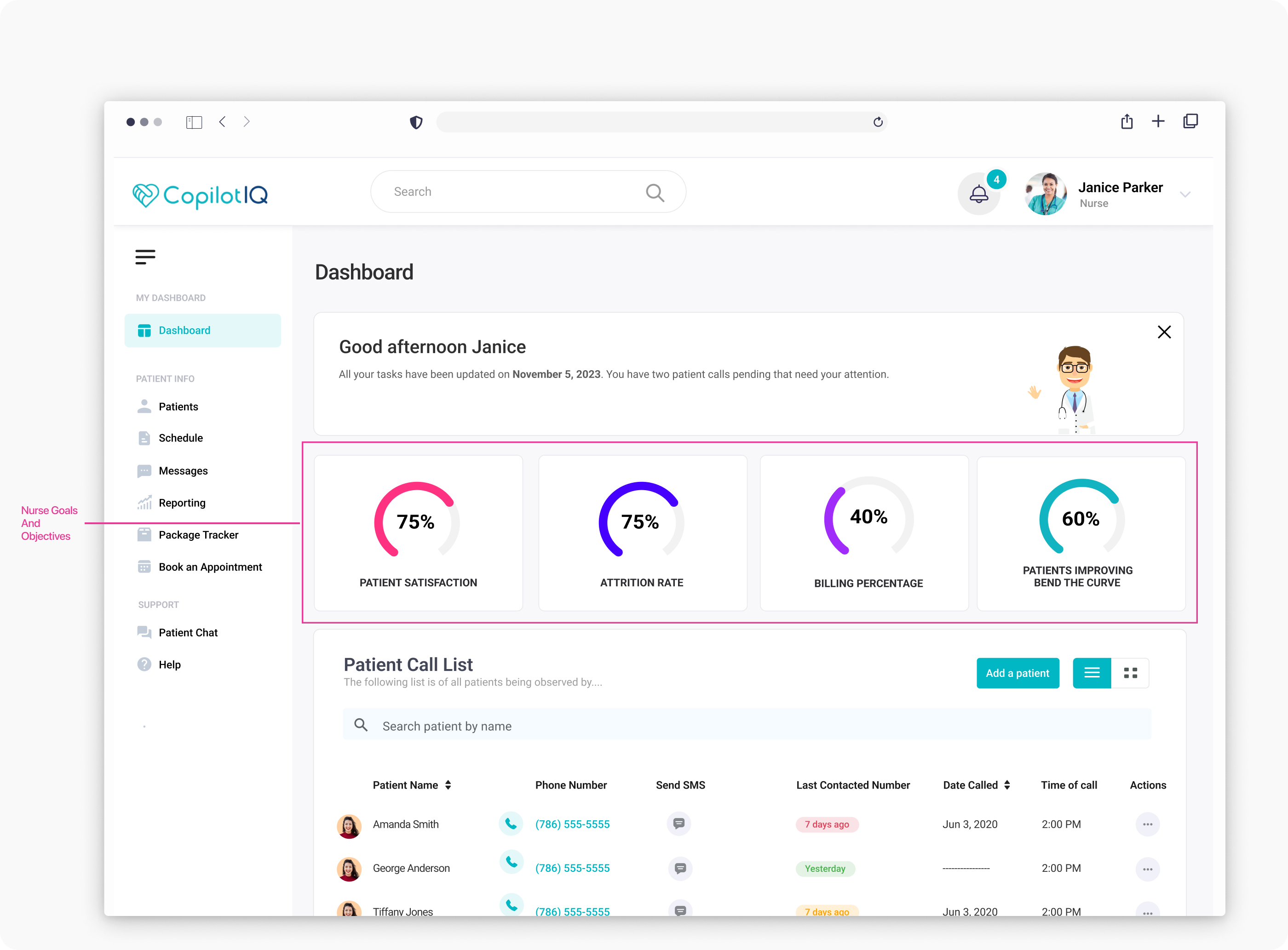 Design began with the set of tools and features needed by an individual nurse to track and monitor patient health. The task manager also consists of goals and performance metrics the nurse will be able to track.