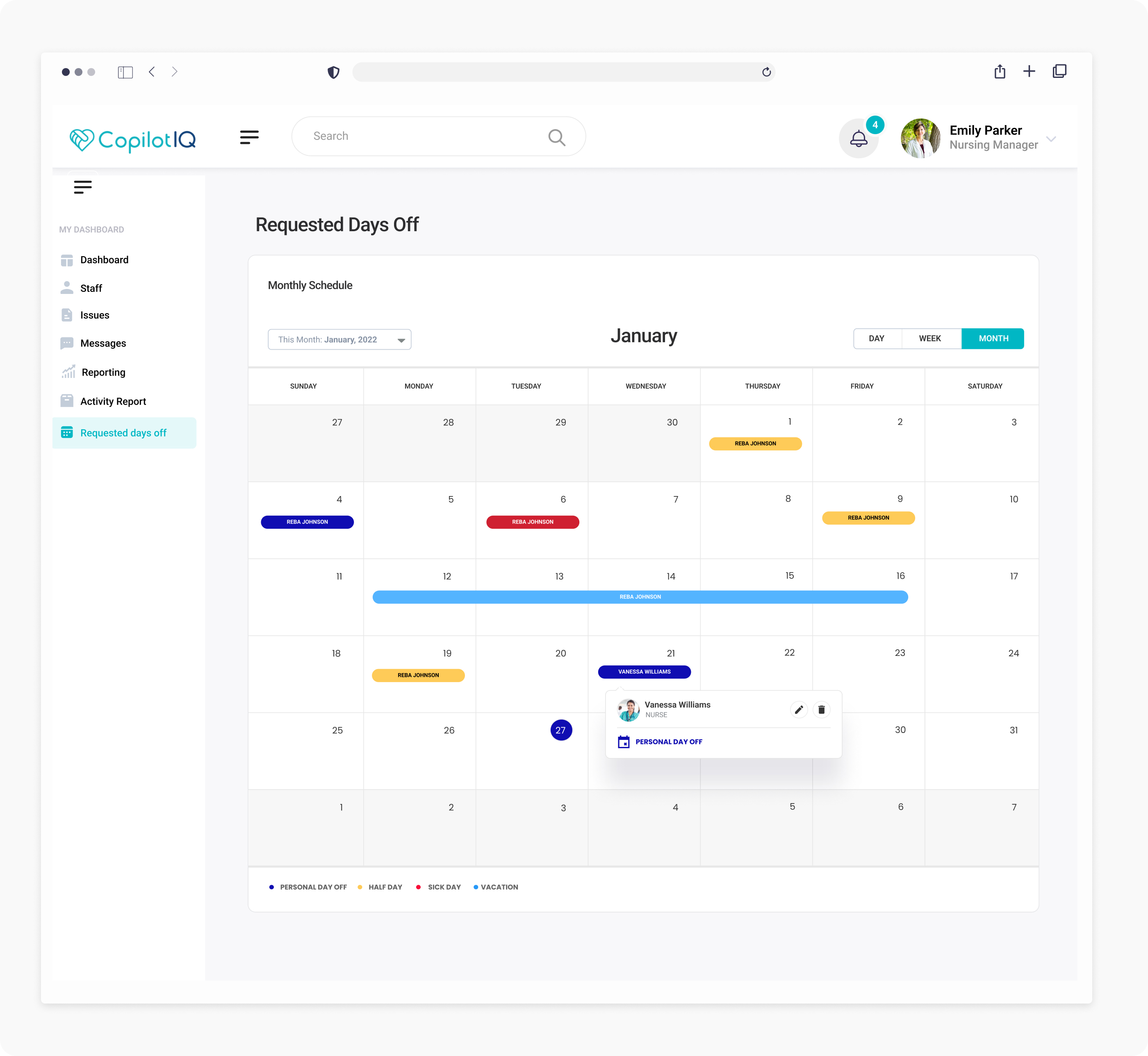 The Nursing manager through a dffferent user type login, will be able to track the performance of each individual nurse and also of the entire nursing team. This gives the nursing manager a global view of the daily operations and nurse to patient interactions.