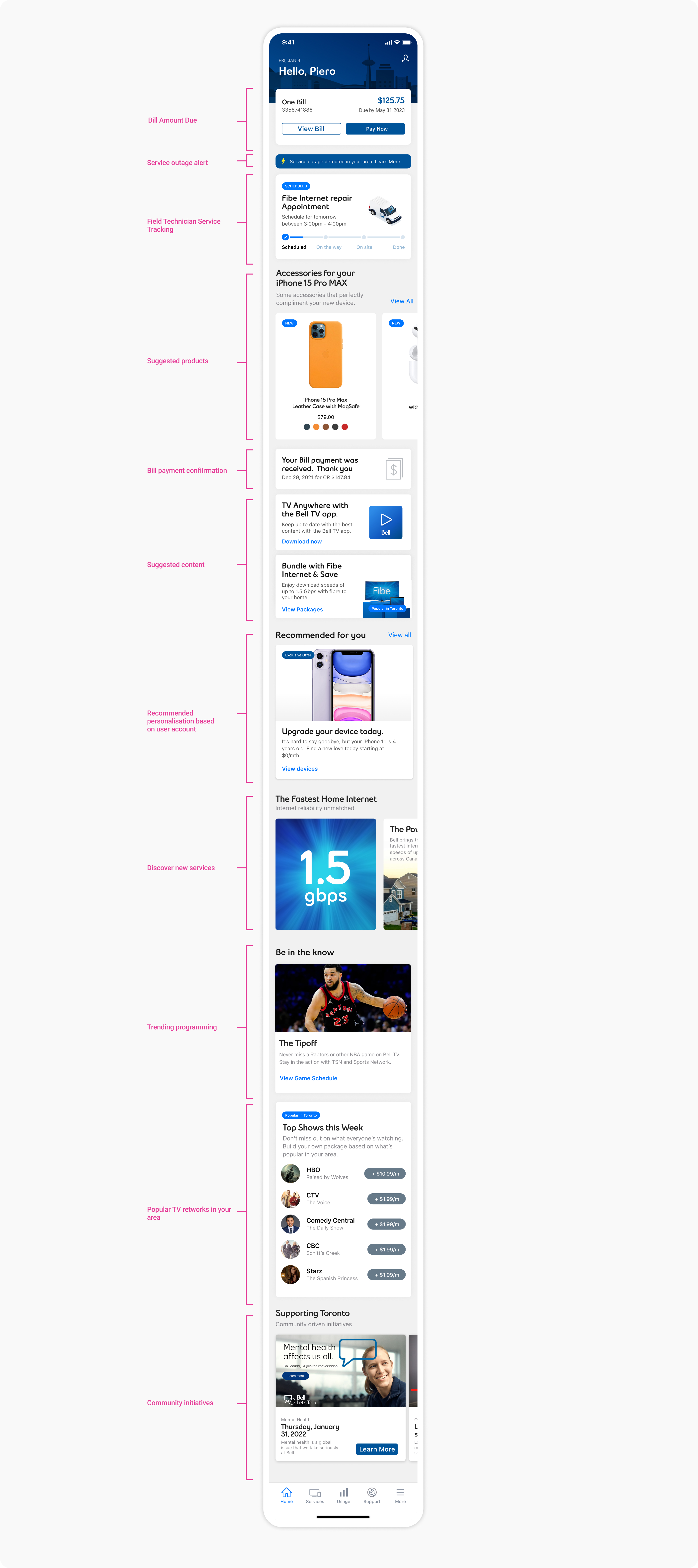 The personalized home feed initiative transformed Bell's app experience from a generic services screen into a personalized, account-aware interface—successfully bridging service discovery with business efficiency through personalization, onboarding, and engagement.