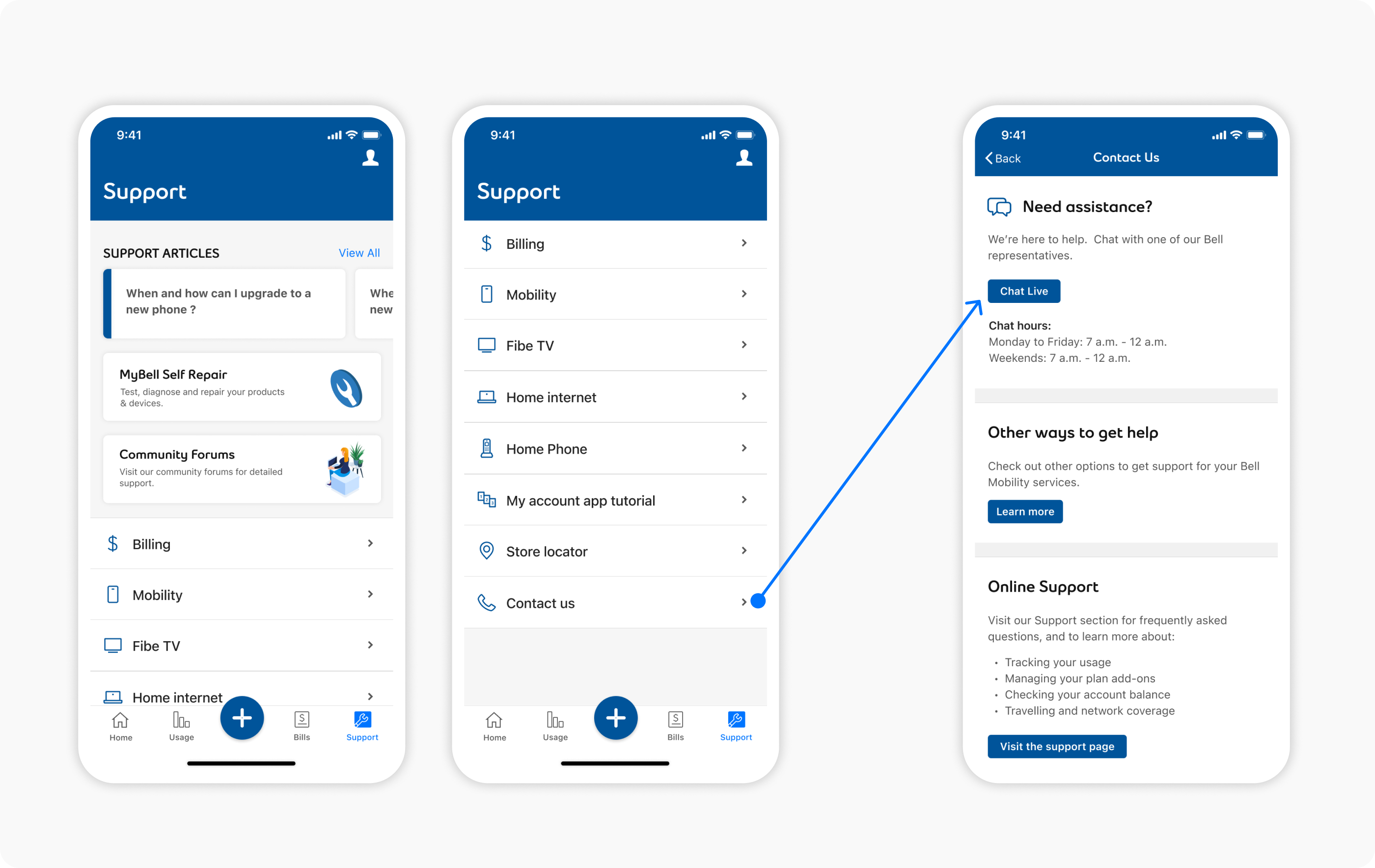 We benchmarked conversational AI experiences from leading technology companies (Amazon Alexa, Google Assistant, Apple Siri) and service platforms (banking chatbots, e-commerce assistants) to inform a more natural, effective virtual assistant experience. Key insights revealed that successful virtual assistants prioritize natural language understanding, context awareness, and graceful handoff to human agents when needed. We adapted these patterns to Bell's support ecosystem, creating a virtual assistant that could handle common inquiries while seamlessly escalating complex issues—transforming support from a crisis into a competitive advantage.