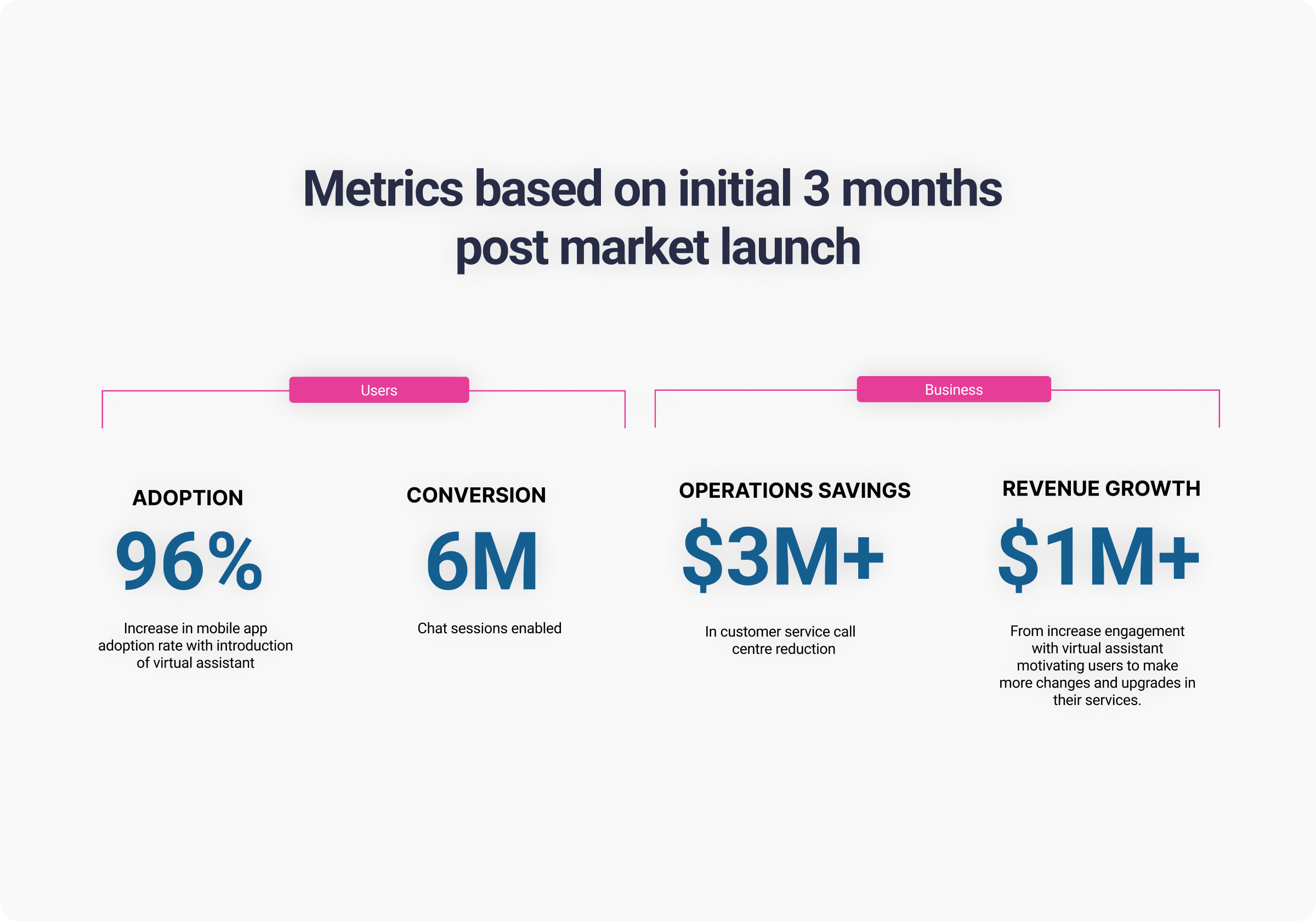 Users hate IVR menus and rigid button flows. During research, we learned that users preferred asking questions in their own words rather than navigating through structured menus. By designing for natural language understanding instead of menu hierarchies, we created a virtual assistant that felt human-like and conversational rather than robotic or scripted. The key was understanding intent from conversational input—enabling users to ask "Why is my bill higher?" instead of navigating through "Billing" → "Bill Inquiry" → "Bill Changes" menus.