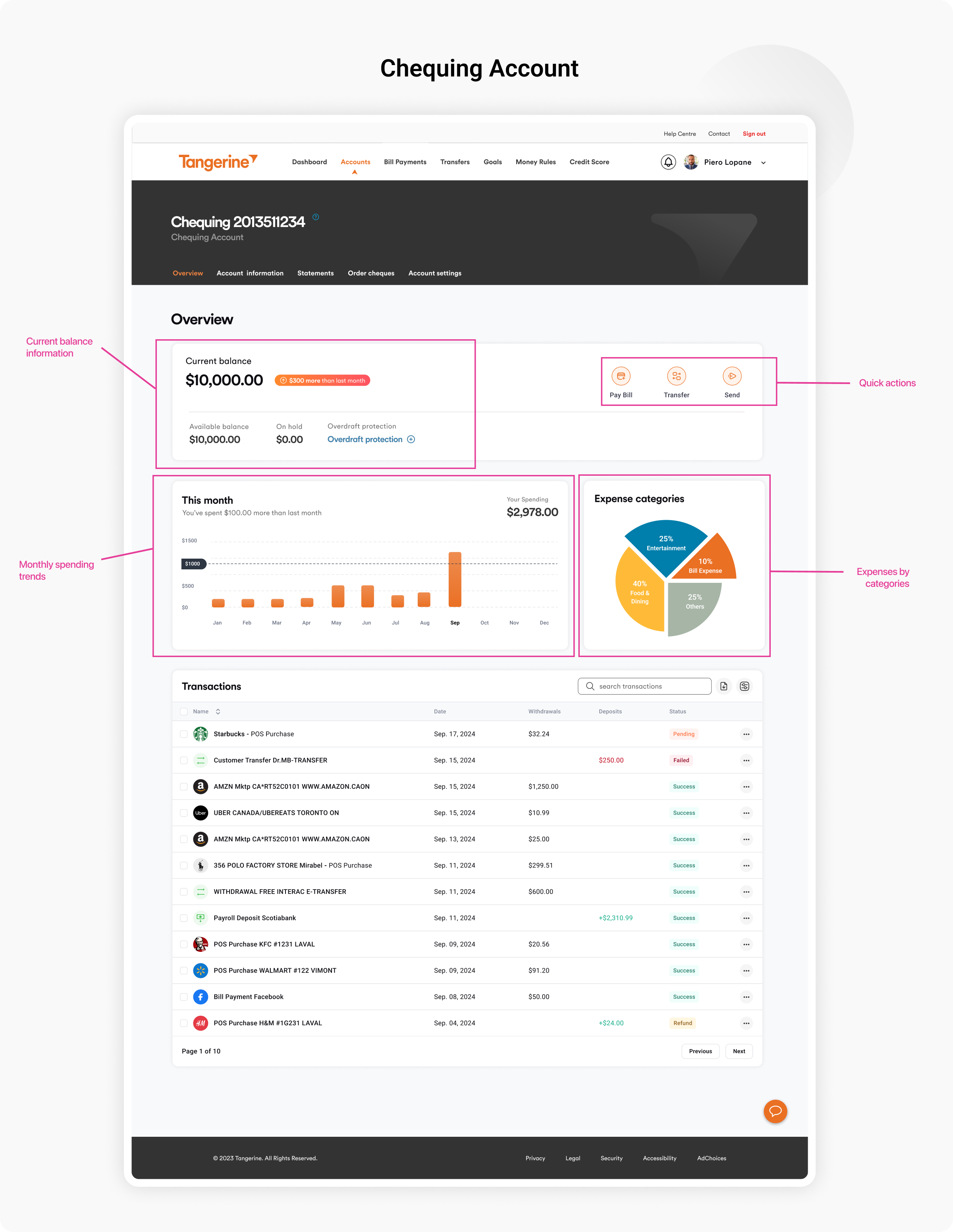 We redesigned Tangerine's web banking experience to compete with fintech disruptors, creating a faster, simpler, data-informed interface that reduces task time, enables self-service, and improves conversion rates. The new experience simplifies navigation, reorganizes information architecture, and enables users to complete banking tasks without support intervention—transforming Tangerine from a lagging digital bank into a competitive player in the Canadian banking landscape.